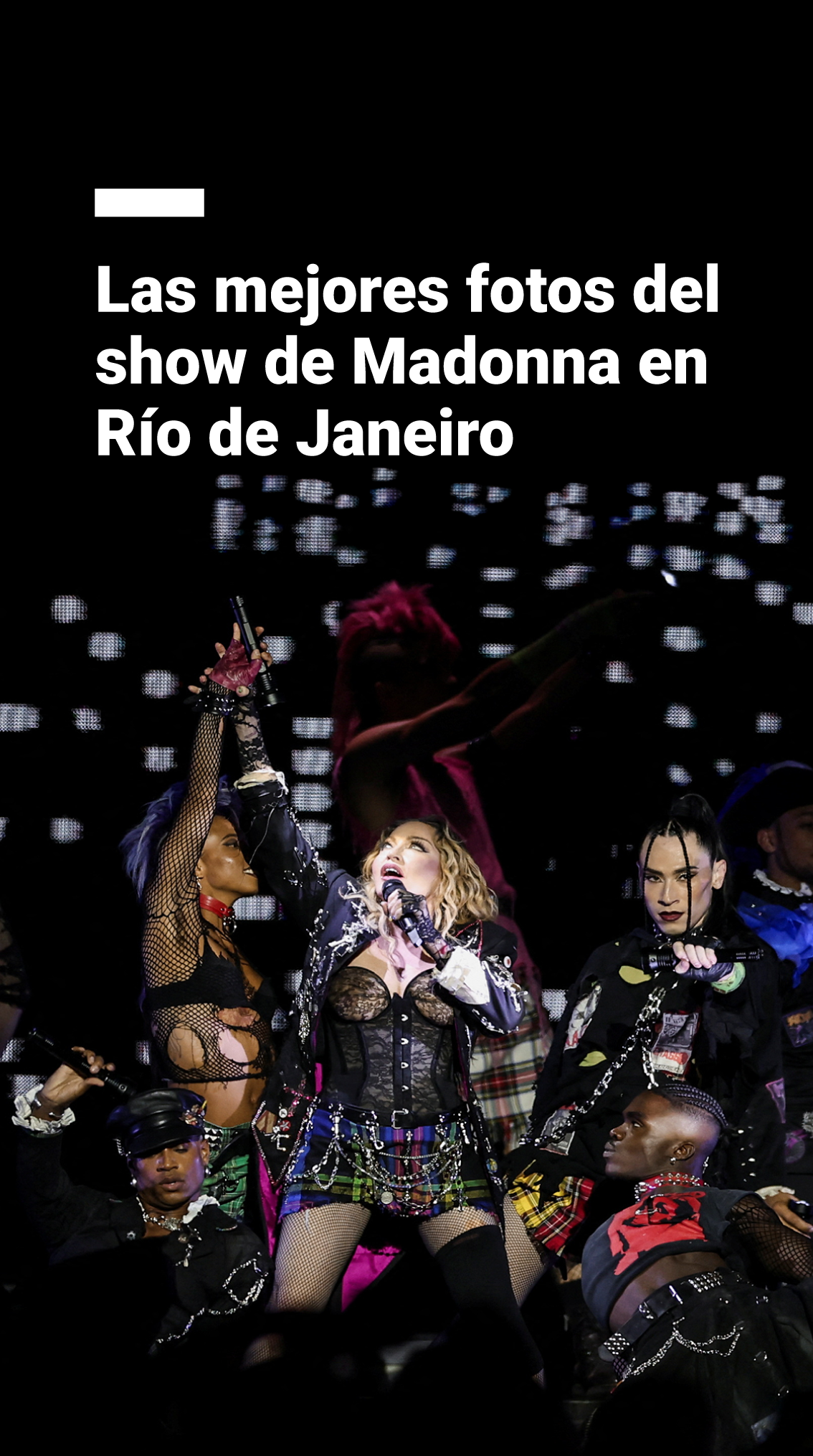 Madonna junto a sus bailarines luce uno de los looks más impactantes de la noche.