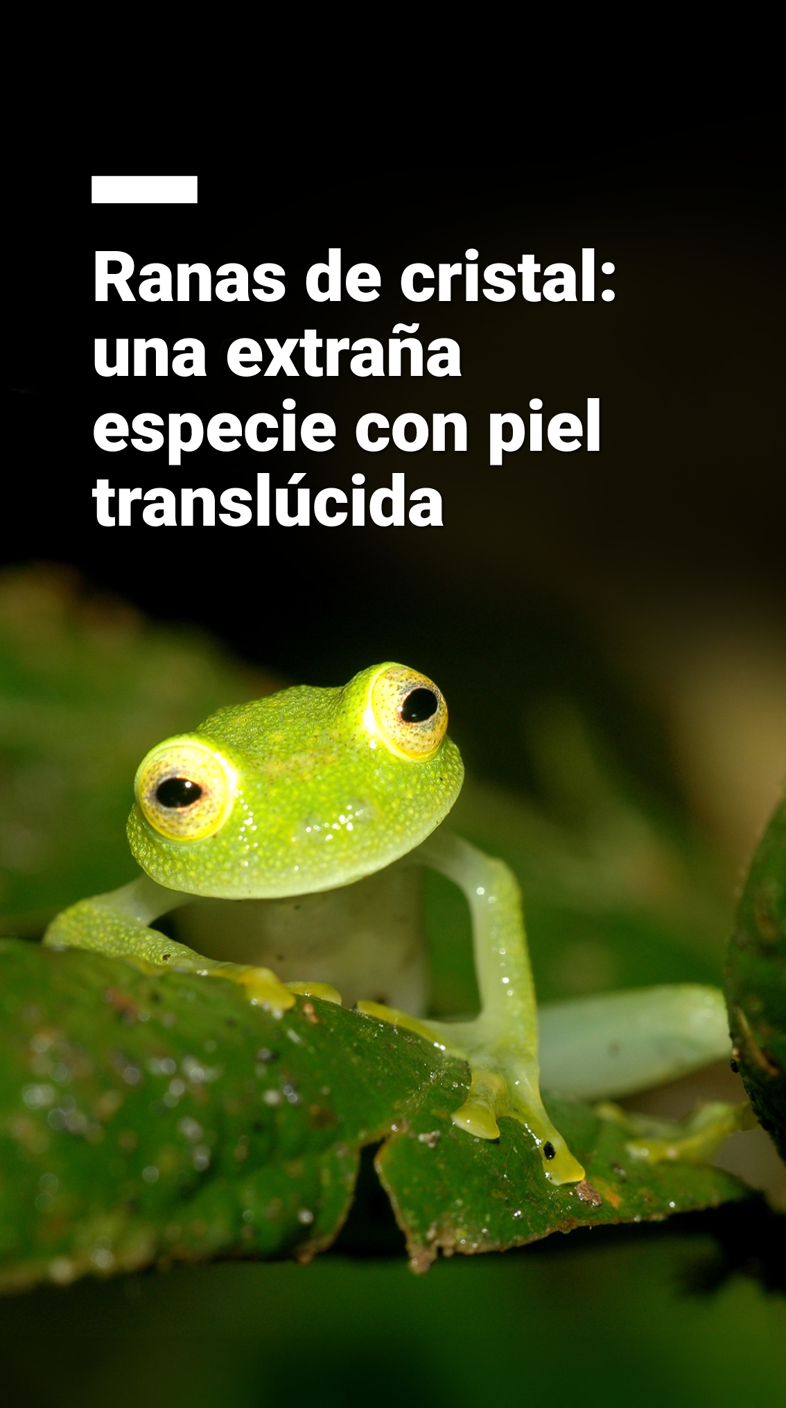 Se les llama ranas de cristal al grupo de anfibios de la familia Centrolenidae, porque su piel dorsal es transparente o completamente translúcida.